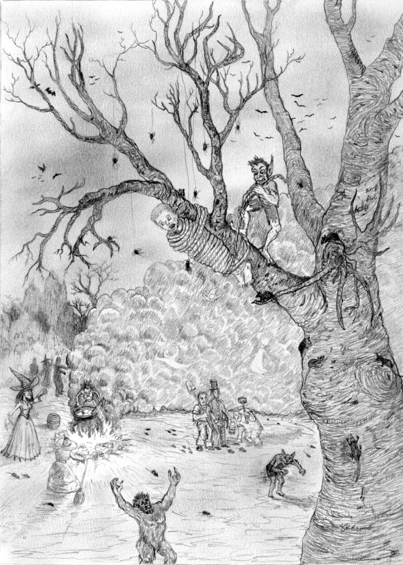 You find that they have taken you high into the trees. They bind you to a limb that is swaying in the breeze. Below starts the dance of the ghosts and the ghouls, witches, and men with grave digging tools.